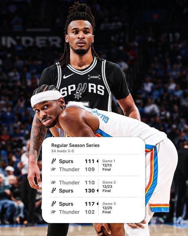 体坛周报全媒体记者 孔德昕 简直有球队能在7场比赛里打败雷霆4次吗?当卫冕冠军以24胜1负开启新赛季征途时,这个问题的谜底无穷接近于“莫得”。但脚下,圣安东尼奥马刺篡改了一切。 北京技艺12月26日,马刺客场117比102大捷雷霆,本赛季衔接第三次打败卫冕冠军,况且这3场比赛就发生在往常13天内,往常两战马刺更是连胜雷霆!若是将两队的交锋放在一轮系列赛里,雷霆仍是0比3过期,而咱们皆知谈,NBA季后赛历史上从未有球队能完成0比3过期的大逆转。 也曾看上去天涯海角的雷霆,就这么被马刺踩在了脚下。